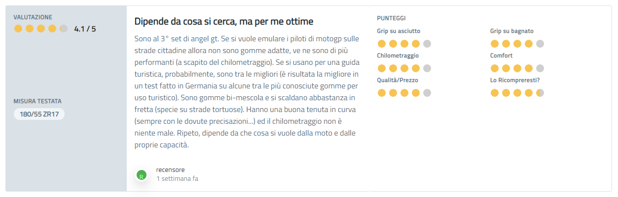 Dipende da cosa si cerca, ma per me ottimeSono al 3° set di angel gt. Se si vuole emulare i piloti di motogp sulle strade cittadine allora non sono gomme adatte, ve ne sono di più performanti (a scapito del chilometraggio). Se si usano per una guida turistica, probabilmente, sono tra le migliori (è risultata la migliore in un test fatto in Germania su alcune tra le più conosciute gomme per uso turistico). Sono gomme bi-mescola e si scaldano abbastanza in fretta (specie su strade tortuose). Hanno una buona tenuta in curva (sempre con le dovute precisazioni…) ed il chilometraggio non è niente male. Ripeto, dipende da che cosa si vuole dalla moto e dalle proprie capacità.