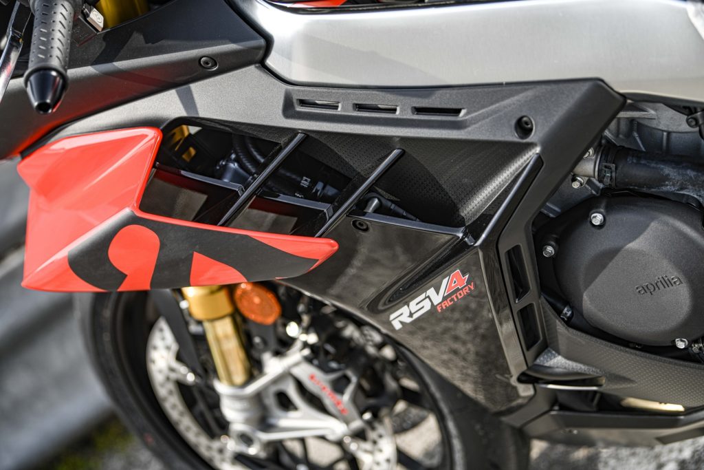 Le superfici particolarmente ridotte delle fiancate lasciano completamente scoperta la ruota anteriore, con benefici nella maneggevolezza nei cambi di direzione, soluzione già utilizzata dalla RS-GP in MotoGP. I tratti principali della carenatura parlano il linguaggio tipico delle Aprilia sportive di ultima generazione, contraddistinto da forme dinamiche, moderne, dalle superfici contenute; il caratteristico gruppo ottico anteriore triplo a LED, dotato di luci DRL perimetrali posizionate sul contorno dei due proiettori principali, rende RSV4 immediatamente riconoscibile in ogni condizione di luce. Gli indicatori di direzione sono integrati nei profili DRL e rendono la sezione frontale ancora più compatta.