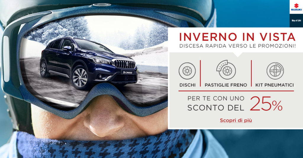 Fino al prossimo 15 novembre i Concessionari e i Riparatori Autorizzati Suzuki sono protagonisti di una nuova campagna che testimonia una volta di più la grande attenzione della Casa di Hamamatsu per il tema della sicurezza. L’iniziativa ha come slogan “Inverno in vista. Discesa rapida verso le promozioni!” e prevede uno sconto del 25% sull’acquisto di dischi, pastiglie freno di ricambio e kit di ruote con gomme invernali, composti da gomme con pittogramma alpino, cerchi e sensori Tpms.