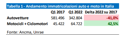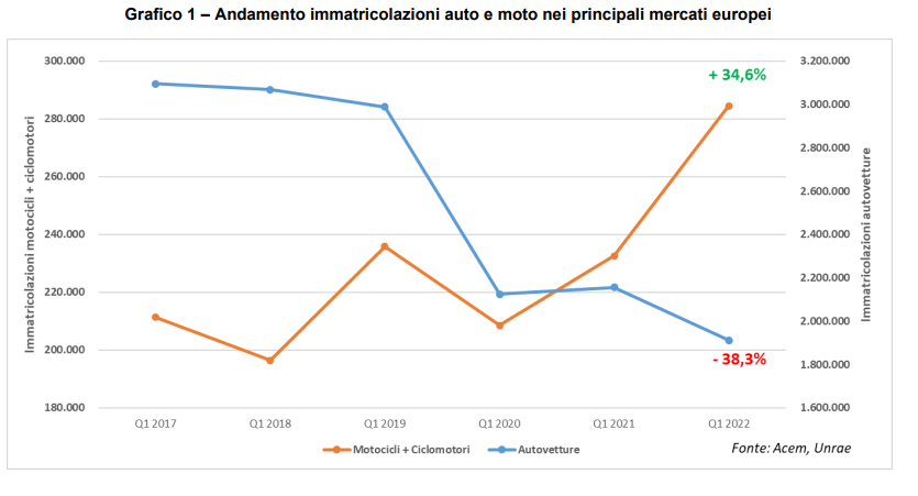 A livello europeo negli ultimi cinque anni si è assistito ad un calo del 38,3% delle immatricolazioni di autovetture, passate dai 3 milioni del primo trimestre 2017 ad 1 milione e 900mila del primo trimestre 2022, a fronte di una netta crescita di quelle dei veicoli a due ruote, salite al +34,6%, passate da 210mila ad oltre 280mila