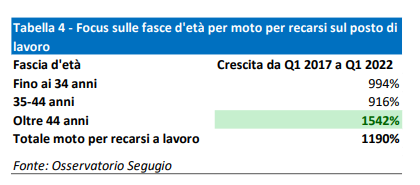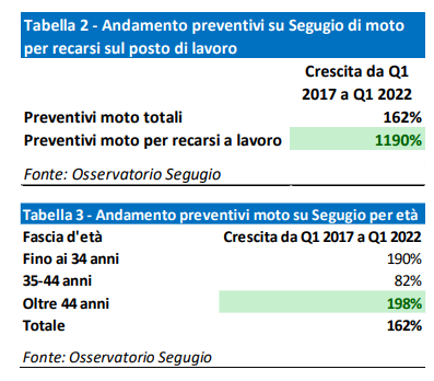 Segugio.it, leader nella comparazione assicurativa in Italia, ha quindi analizzato i preventivi effettuati dagli utenti negli ultimi anni per approfondire il trend e, come mostrato nella Tabella 2, dal primo trimestre 2017 al primo trimestre Tabella 1 – Andamento immatricolazioni auto e moto in Italia Q1 2017 Q1 2022 Delta 2022 su 2017 Autovetture 581.496 342.804 -41,0% Motocicli + Ciclomotori 45.422 64.722 42,5% Fonte: Ancma, Unrae 2022, si assiste ad una forte crescita dei preventivi moto, pari al 162%, a conferma dell’incrementato interesse per le due ruote. Questa crescita è ancora più forte per quei motociclisti che dichiarano di utilizzare il mezzo per recarsi sul posto di lavoro, i cui preventivi sono cresciuti addirittura del 1190%. Allo stesso tempo si nota (Tabella 3) come dal 2017 al 2022 sia stata la fascia anagrafica oltre i 44 anni a crescere maggiormente in termini di preventivi moto, con un +198%, seguita a stretto giro dalla fascia under 35 e poi da quella 35-44.