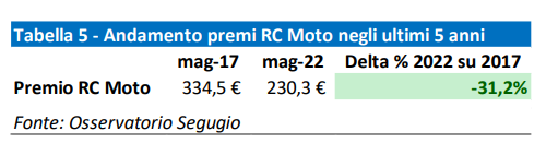 Questo spostamento dell’interesse da auto a moto, negli ultimi anni, è stato favorito anche dall’andamento positivo dei prezzi RC Moto. La Tabella 5 mostra come il premio medio di maggio 2022, pari a 230,3€, sia in calo ben del 31,2% rispetto a quanto registrato nello stesso mese del 2017. Il crollo dei prezzi assicurativi è quindi stato un ulteriore driver di spinta per gli italiani nel passare alle due ruote.