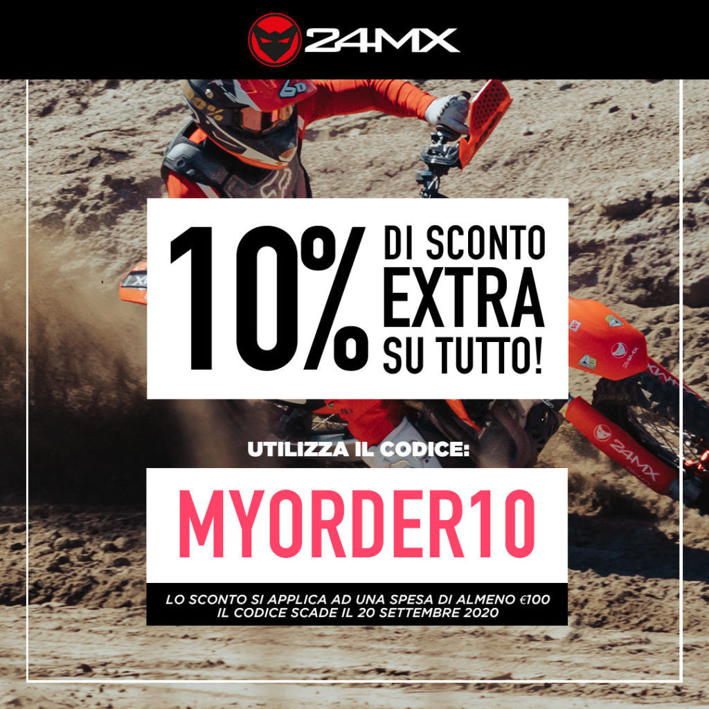 Appassionati di motocross in vena di fare acquisti? Sul sito specializzato 24MX è disponibile uno sconto extra del 10% fino al 20 settembre, che si applica a tutti gli ordini superiori ai 100 euro.