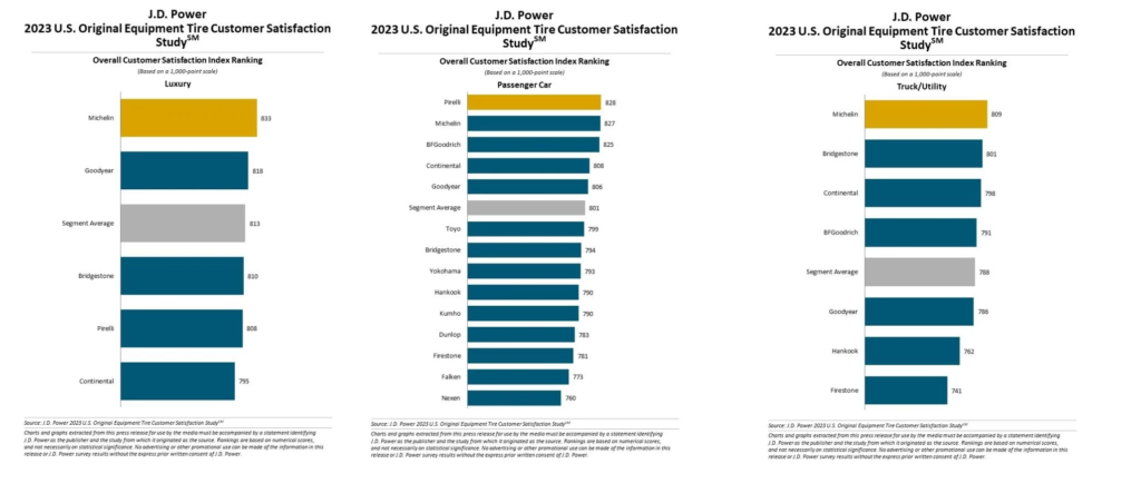 Ogni anno, J.D. Power realizza uno studio che indaga la soddisfazione dei clienti statunitensi per quel che riguarda i loro pneumatici montati in primo equipaggiamento: per il 2023, Michelin vince due classifiche su 3, con Pirelli che conquista l’altra.