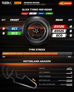 In risposta alla severità del rinnovato asfalto di Aragón, anche la soluzione posteriore riservata a prove, qualifica e Superpole Race è diversa dal solito: al posto dell’extrasoft SCQ, verrà proposta la supersoft di sviluppo E0126, già ben conosciuta dai piloti del WorldSBK, che l’hanno impiegata in cinque round quest’anno.