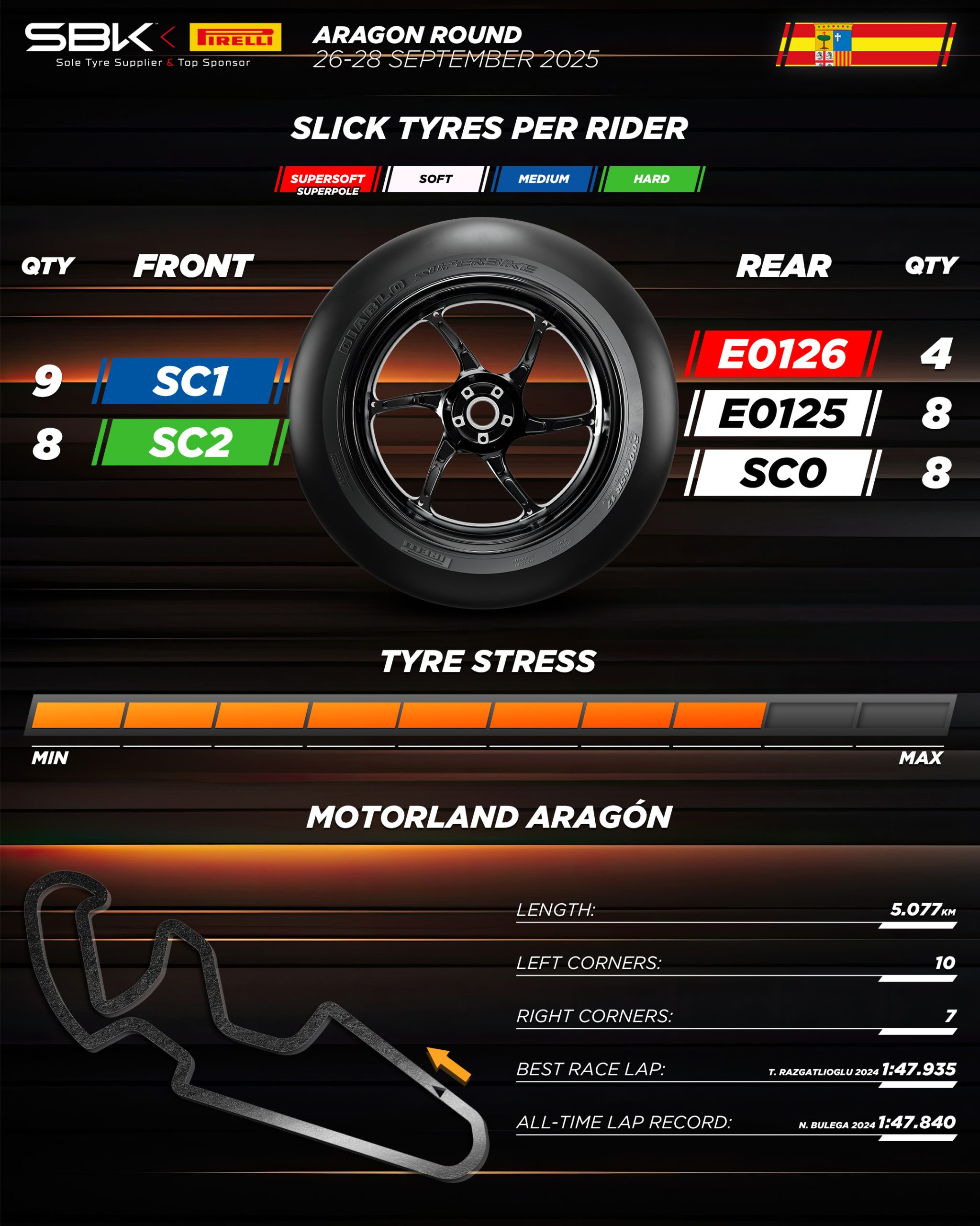 Giorgio Barbier, Direttore Racing Moto, ha affermato: “Il circuito di Aragón è tra i più aggressivi sui pneumatici, in particolare dopo la riasfaltatura effettuata nel 2024, quindi, come già accaduto lo scorso anno, proponiamo un’allocazione orientata a una maggiore protezione dall’usura. Grazie all’introduzione della nuova carcassa, che ha permesso un importante passo avanti in termini di prestazione e costanza su tutte le specifiche a cui è stata applicata, siamo in grado di offrire ai piloti del WorldSBK opzioni valide sia a livello di performance pura sia di costanza, anche su un tracciato severo come il Motorland Aragón. La extrasoft SCQ, solitamente opzione posteriore di riferimento per qualifiche e Superpole Race, sarà qui sostituita dalla supersoft E0126, versione di sviluppo della SCX di gamma. Non si tratta di un impiego totalmente inedito per questa specifica, a Misano e Magny-Cours è già risultata la più scelta anche per la Superpole Race. Per Gara1 e Gara2, i piloti potranno scegliere tra due soluzioni soft: la SC0 di gamma e la sua evoluzione di sviluppo E0125. Al di là delle statistiche di utilizzo, ciò che oggi ci colpisce maggiormente sono i feedback estremamente positivi ricevuti dai piloti: entrambe le soluzioni di sviluppo sono così apprezzate da diventare, nei round in cui sono presenti, la scelta immediata già dai primi turni del weekend. Il circuito di Aragón, con la severità del suo asfalto, sarà quindi un ottimo banco di prova per le nuove soluzioni di sviluppo e ci permetterà di raccogliere ulteriori informazioni e dati sul loro comportamento e sulla loro efficacia.”