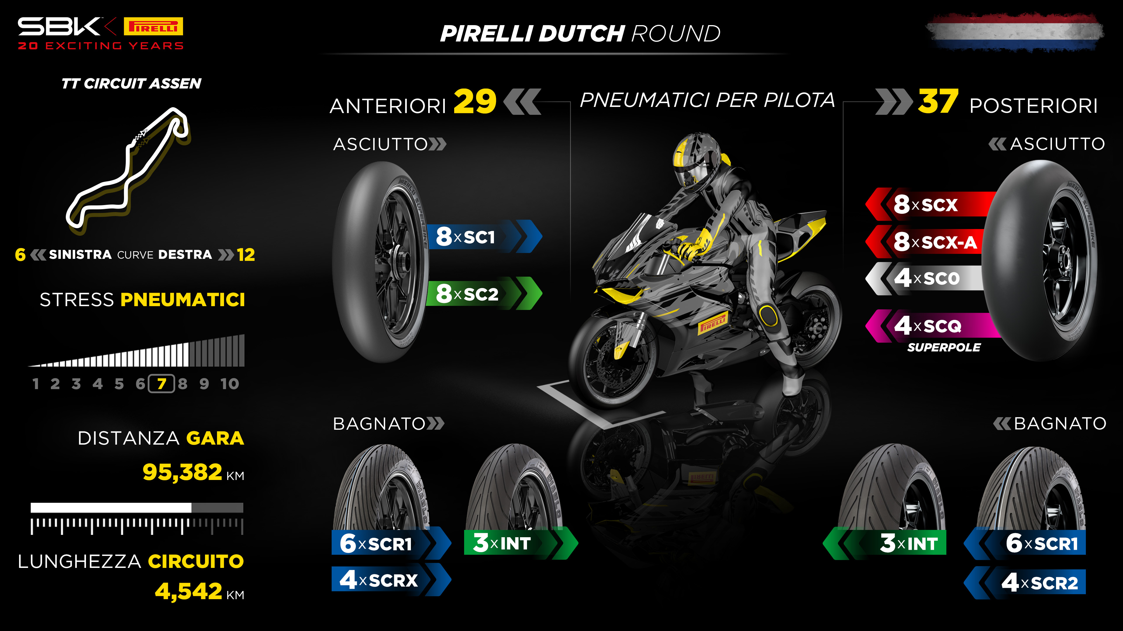 Giorgio Barbier, direttore racing moto Pirelli, ha affermato: “Con Assen il Campionato entra nel vivo: arriviamo in Europa e prendono il via anche WorldSSP300 e Yamaha R3 bLU cRU European Cup. Rispetto allo 2022, in cui è stato sempre utilizzato in ogni gara un set di SC1 anteriore e posteriore, quest’anno i piloti della 300 inizieranno la stagione con mescola SC2 posteriore così da far fronte ad eventuali problematiche, in termini di cold tearing, riscontrate nelle prime gare europee di primavera, tipicamente più fredde soprattutto nei turni di prima mattina. Essendo la SC2 più protetta rispetto alla SC1, questa scelta dovrebbe essere risolutiva. Contiamo poi di proseguire la stagione sempre con SC2 posteriore ma, soprattutto nelle gare più calde, non escludiamo un possibile ritorno alla SC1 qualora la SC2 non dovesse generare un livello di grip adeguato. Il lavoro nel WorldSBK e WorldSSP è invece focalizzato su due confronti diretti. In Superbike vogliamo vedere tra SCX di gamma e SCX di sviluppo B0800 quale verrà più apprezzata dai piloti; in Supersport si tratta di un raffronto tra misure, quella standard 120/70 e la 125/70 che è già usata dai fratelli maggiori del WorldSBK. L’obiettivo, in caso di riscontro positivo, è quello di far adottare anche alla Supersport la misura anteriore della classe regina. Come sempre, queste verifiche non si esauriranno con Assen ma proseguiranno anche nei round a seguire in modo da raccogliere elementi sufficienti ad una accurata valutazione”.