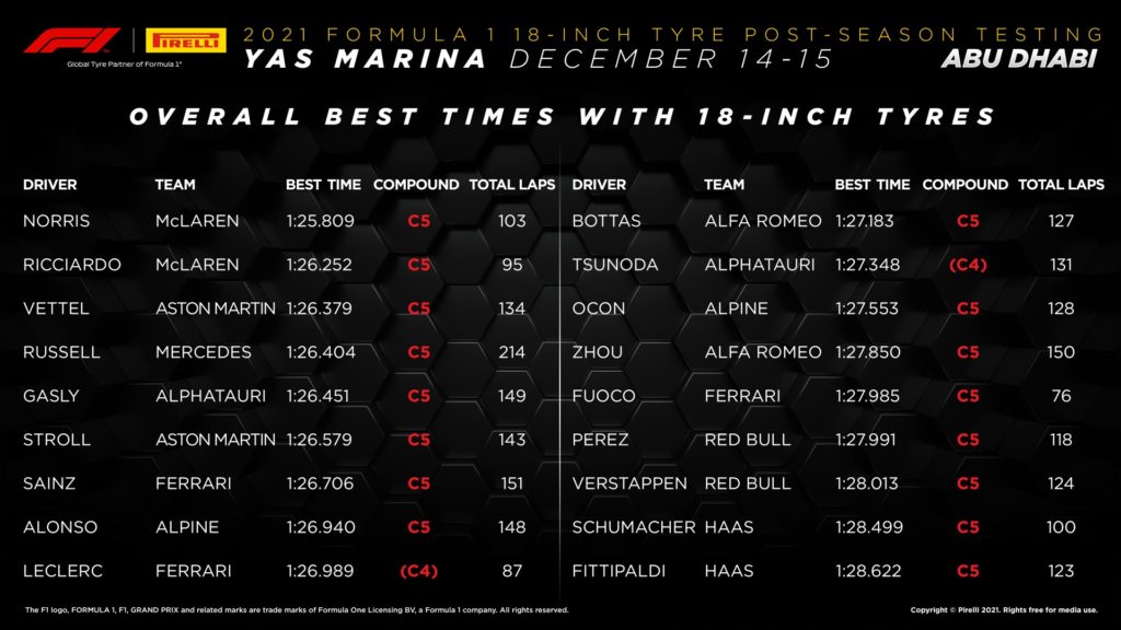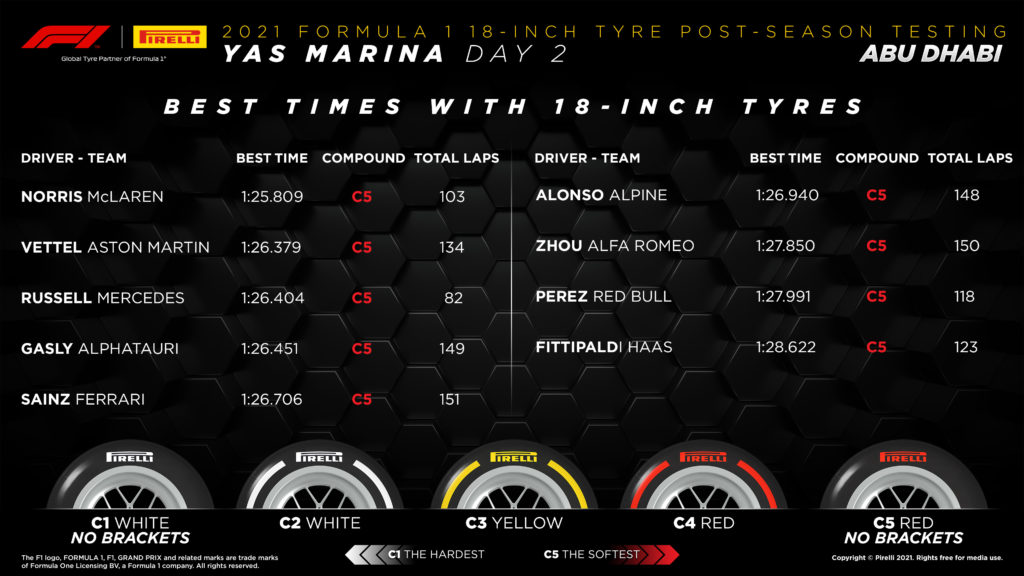 Le due giornate di test di fine stagione della Formula 1 si sono svolte in condizioni di asciutto e con temperature dell’aria comprese tra 18 e 32 gradi centigradi e dell’asfalto tra 20 e 42 gradi: utilizzando delle mule car, i team hanno avuto l’opportunità di provare tutte e cinque le mescole slick dei nuovi pneumatici da 18 pollici nella specifica omologata che verrà usata a partire dalla prossima stagione. Il pilota più veloce è stato Lando Norris (McLaren) nella seconda giornata di test con il tempo di 1:25.809.