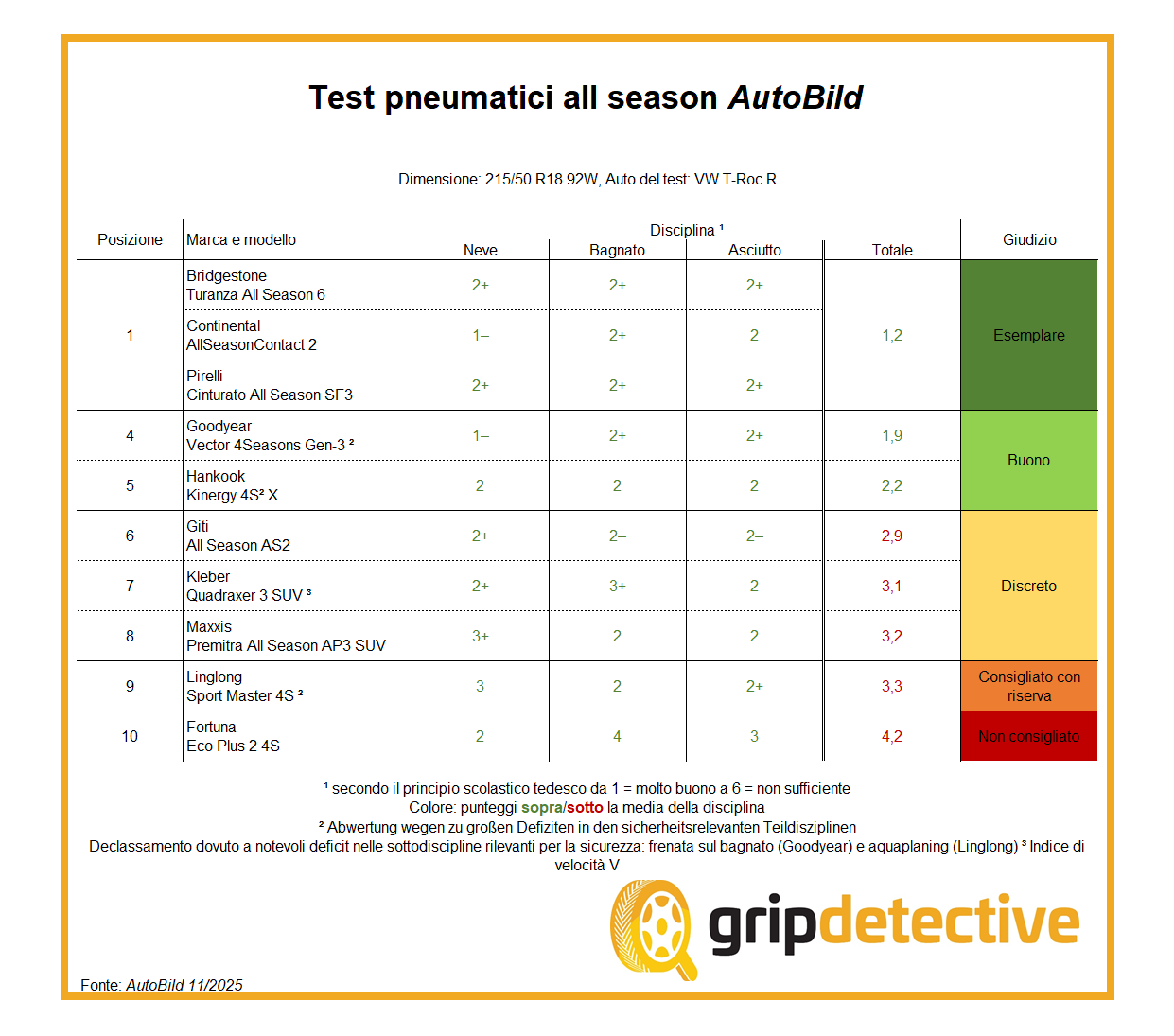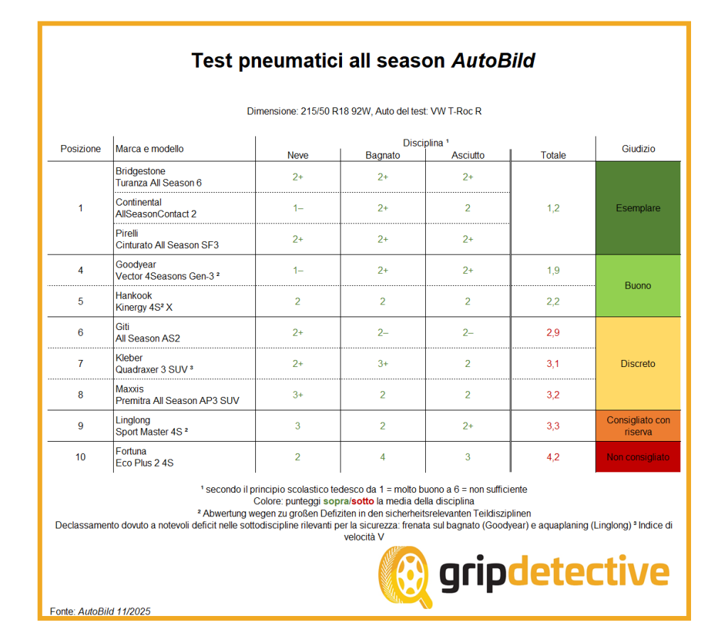 In questa lunghissima stagione di test, AutoBild ha pubblicato un’altra prova: nel numero 43/2025, ha testato 10 gomme 4 stagioni per SUV nella dimensione 215/50 R18.