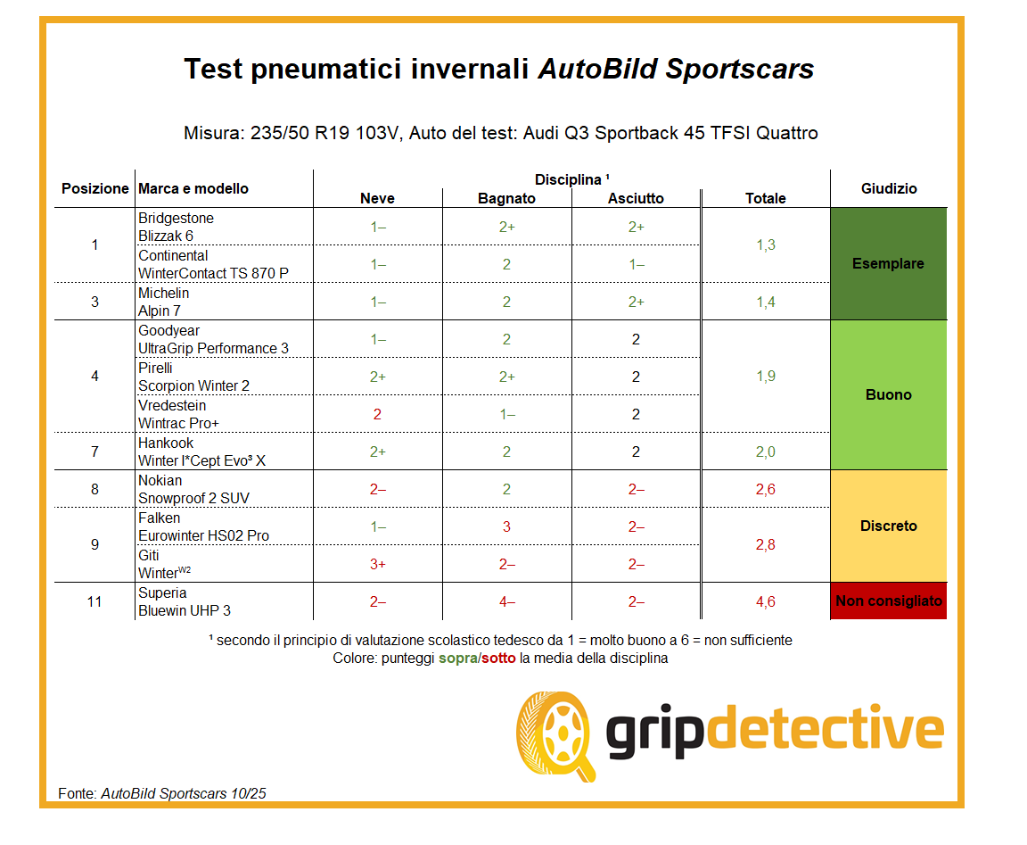 Per quanto riguarda i test sui pneumatici, il Gruppo AutoBild si sta muovendo rapidamente: poco dopo aver pubblicato il confronto di prodotti sui pneumatici all-season per SUV nella misura 215/55 R17, la rivista gemella AutoBild Sportscars ha ora pubblicato un test sui pneumatici invernali nella misura 235/50 R19 103V; ecco la classifica 2025.