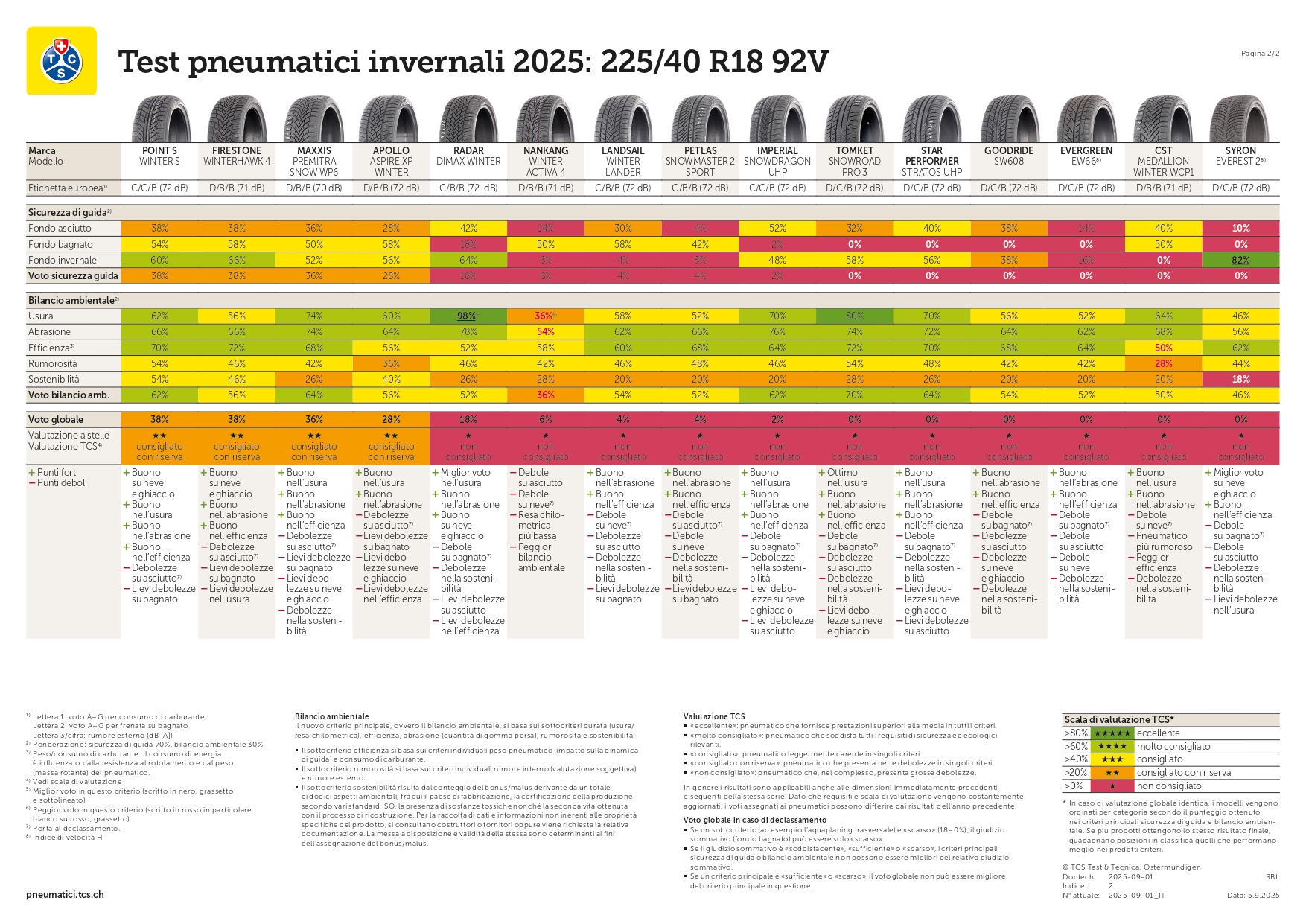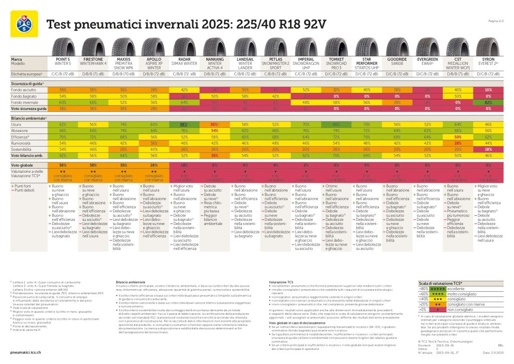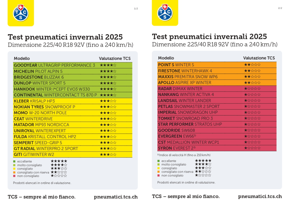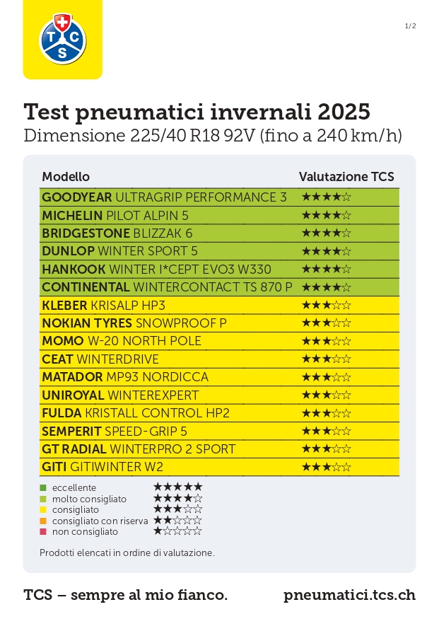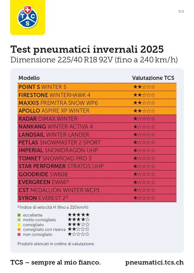 - Il TCS raccomanda di acquistare pneumatici che abbiano ottenuto almeno la menzione «raccomandato» nel test.