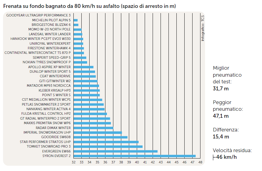Gli scarti tra i migliori e i peggiori pneumatici del test sono particolarmente marcati, soprattutto in frenata sul bagnato. In una frenata d’emergenza da 80 km/h su carreggiata umida, il veicolo equipaggiato con il miglior pneumatico del test, Goodyear UltraGrip Performance 3, si è fermato in 31,7 metri. Lo stesso veicolo, equipaggiato con il pneumatico peggiore, Syron Everest 2, ha invece richiesto 47,1 metri, con un divario di 15,4 metri alla stessa velocità iniziale.