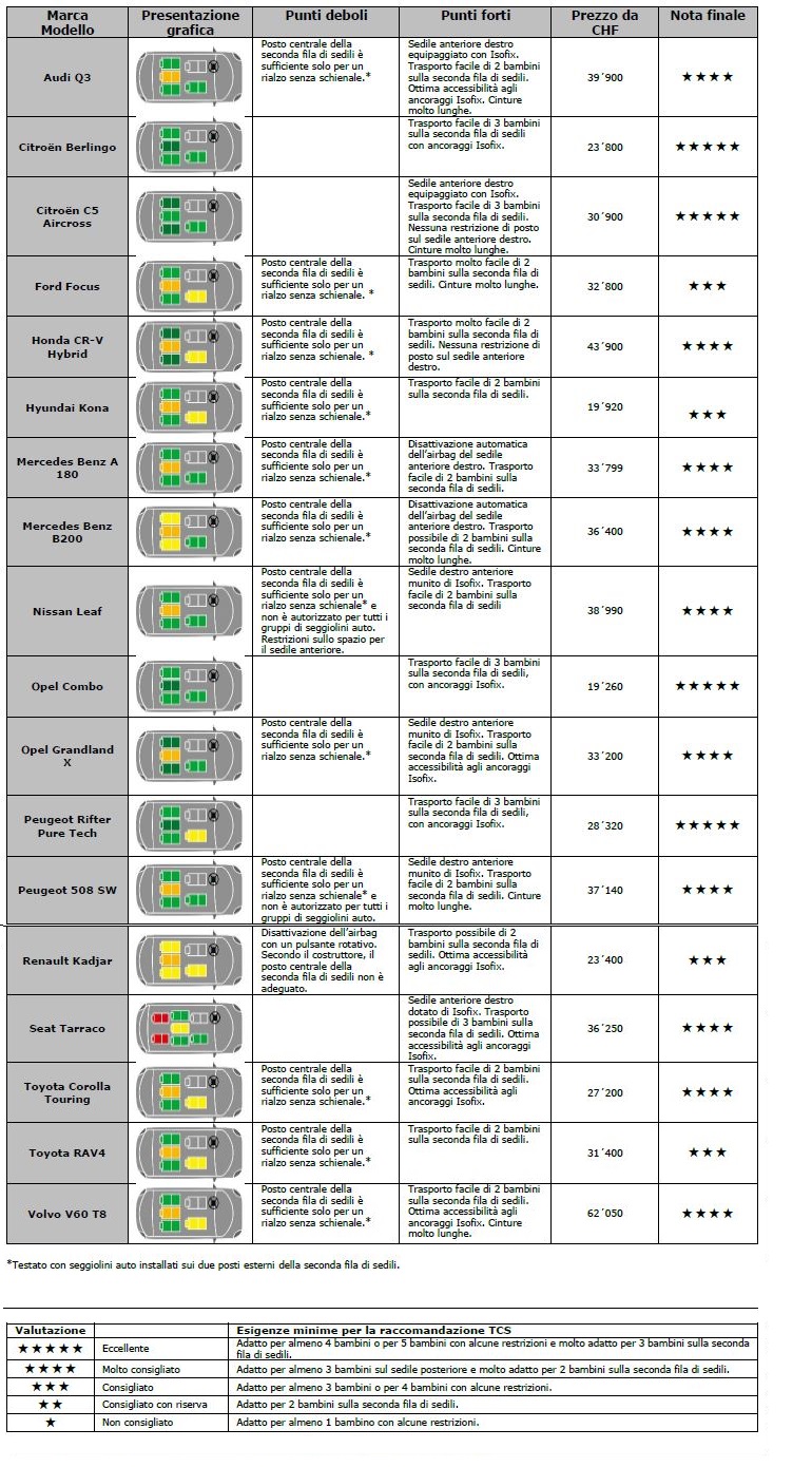 Test seggiolini auto. Un seggiolino auto non è sempre adatto ad ogni automobile; perciò, anche quest’anno, il TCS ha testato diverse auto – del costo fino a 50 mila franchi (circa 46.000 euro) – sull’idoneità al trasporto di bambini. Gli esperti TCS hanno esaminato 18 modelli fra vetture compatte, station wagon e veicoli fuoristrada (SUV): solo quattro di questi veicoli consentono l’alloggiamento di tre seggiolini sul sedile posteriore.