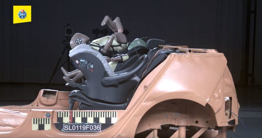 Durante la simulazione dell’incidente, la fibbia della cintura s’è strappata dal guscio del sedile e il manichino del bambino è stato eiettato con forza. In un incidente reale, il bambino avrebbe potuto subire gravi ferite. Per questo motivo, il TCS sconsiglia l’acquisto del modello della marca Chicco “Oasys i-Size”, progettato per bambini dai 40 ai 78 cm di altezza.