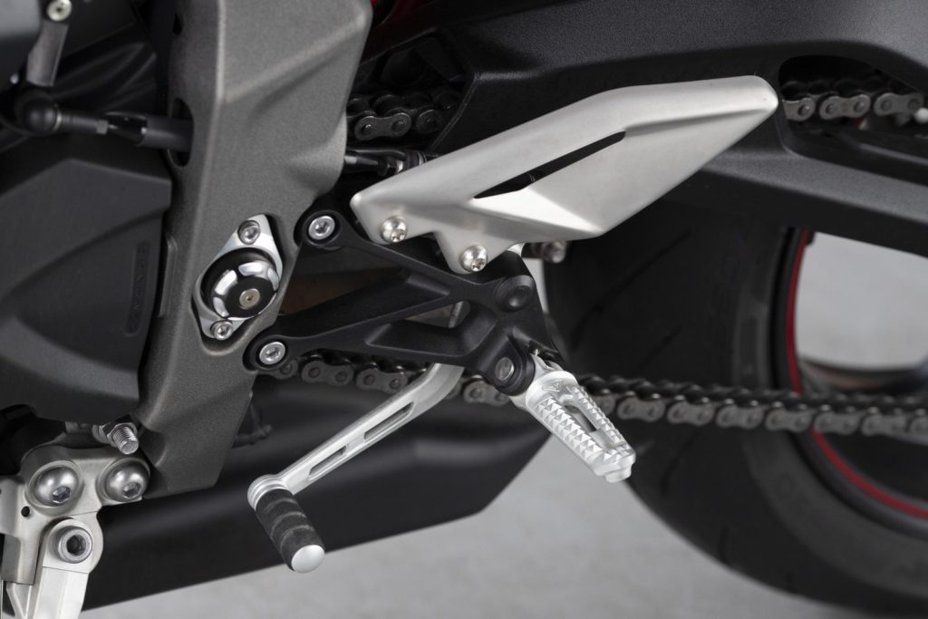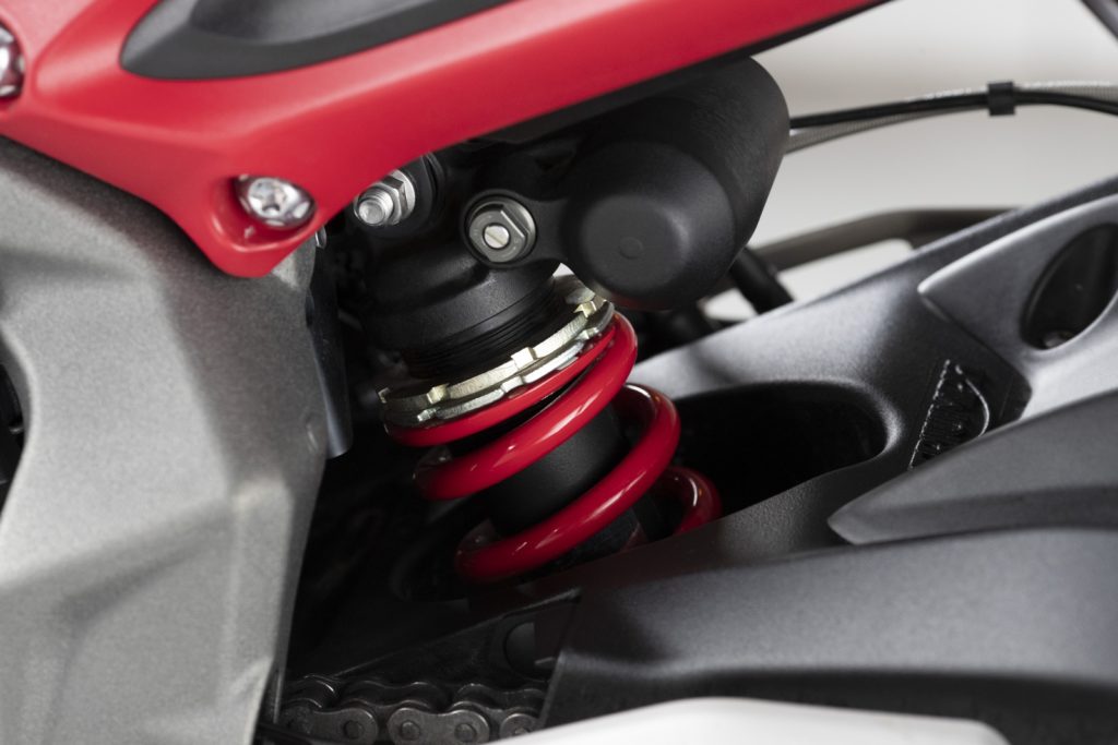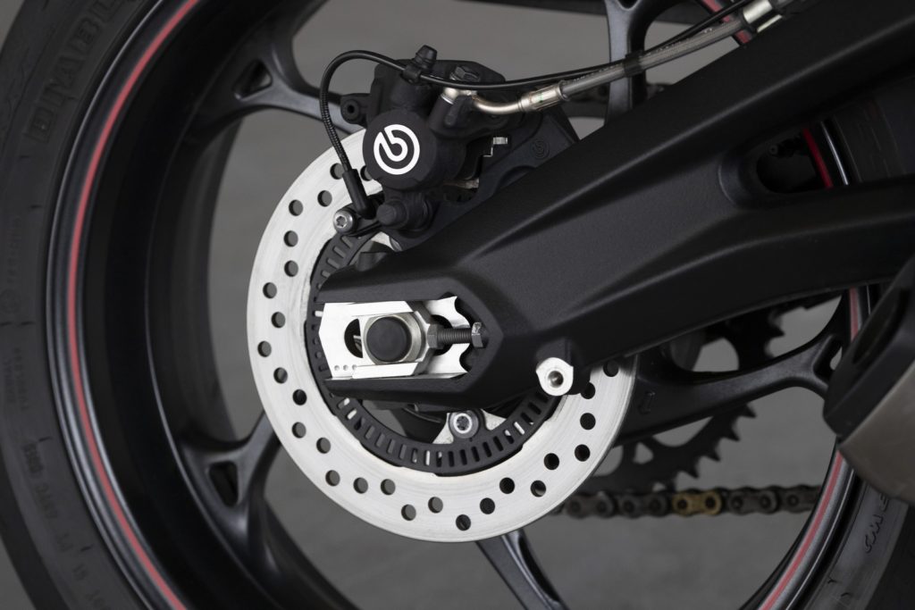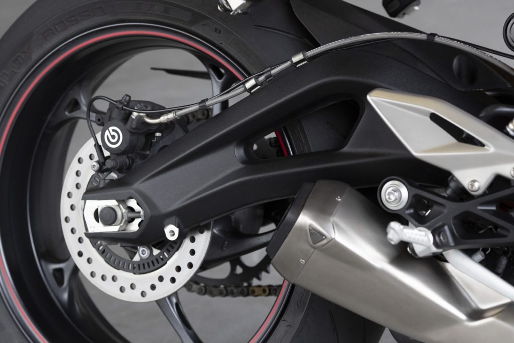 Per migliorare la stabilità della moto ad alta velocità, il forcellone posteriore bibraccio con design ad ali di gabbiano combina elevata rigidità torsionale alla necessaria flessibilità laterale, con un posizionamento modificato del pivot al fine di incrementare l’efficacia del lavoro svolto dall’ammortizzatore in fase di accelerazione: guida ancora più pulita e comportamento sincero in uscita di curva.