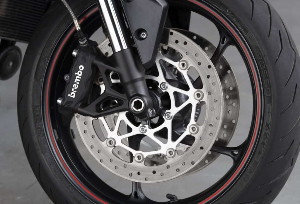 Riconoscibile per il suo assetto neutro e votato alla maneggevolezza, la nuova Street Triple R monta un impianto frenante migliorato e della prestazioni indiscutibili. Le pinze selezionate per l’asse anteriore sono Brembo M4.32 a 4 pistoncini, monoblocco e ad attacco radiale, con pastiglie ottimizzate per offrire ancora più feeling in frenata. Al posteriore, viene montata una pinza Brembo a singolo pistoncino.