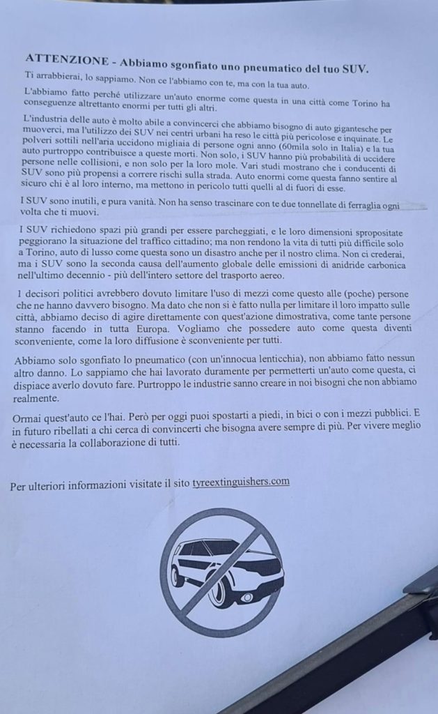 “Possedere un Suv è pura vanità – si legge sul volantino – Non ha senso trascinare con te 2 tonnellate di ferraglia ogni volta che ti muovi. Lo sappiamo che hai lavorato duramente per poterti permettere quest’auto, ci dispiace averlo dovuto fare. A volte l’industria crea bisogni che non abbiamo realmente. Per oggi puoi spostarti in bici, a piedi o coi mezzi pubblici.”