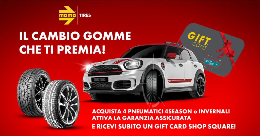 L’iniziativa premierà gli automobilisti che sceglieranno il brand Momo Tires, acquistando, dal 15 ottobre al 30 novembre, quattro pneumatici Momo con cerchio da 16” a salire, presso uno degli oltre 400 rivenditori autorizzati in Italia e attivando la Garanzia Assicurata, a cui verrà data in omaggio una Gift Card Shopsquare.