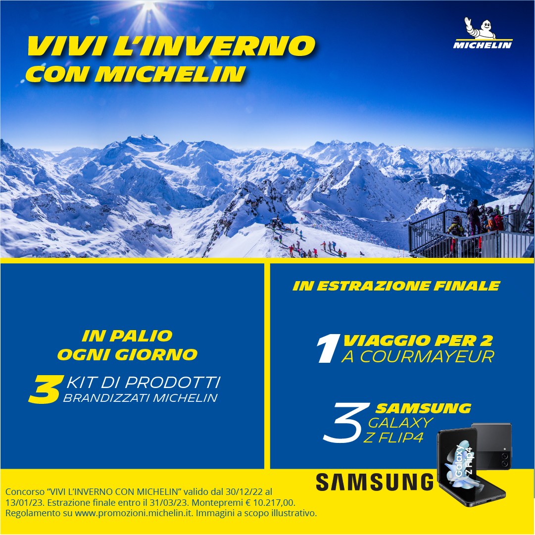 Michelin ha lanciato la nuova promozione invernale “Vivi l’inverno con Michelin”, che permette di vincere ogni giorno un kit di prodotti brandizzati Michelin e come premi finali 3 smartphone Samsung Galaxy Z Flip 4 e 1 viaggio per 2 persone a Courmayeur.