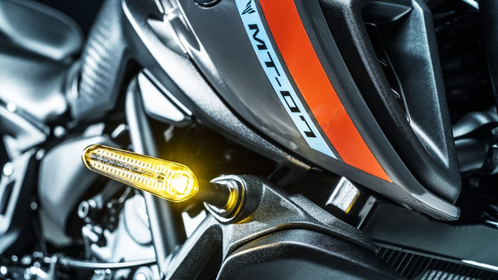 Insieme al nuovo faro anteriore a LED, MT-07 2021 è dotata di nuovi indicatori di direzione ad alta intensità nella parte anteriore e posteriore. Più leggeri e compatti, si integrano con lo stile di nuova generazione della moto e rafforzano le specifiche esclusive di questa vendutissima Hyper Naked.