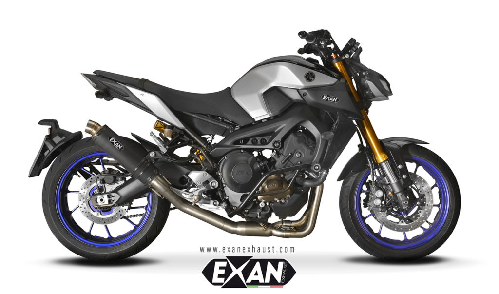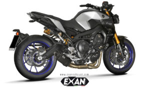 Exan ha presentato due diversi sistemi completi 3in1 catalizzati con uscita alta e bassa e tre diversi scarichi (tutti omologati Euro 4) ognuno capace di stravolgerne le linee e la personalità della Yamaha MT-09.